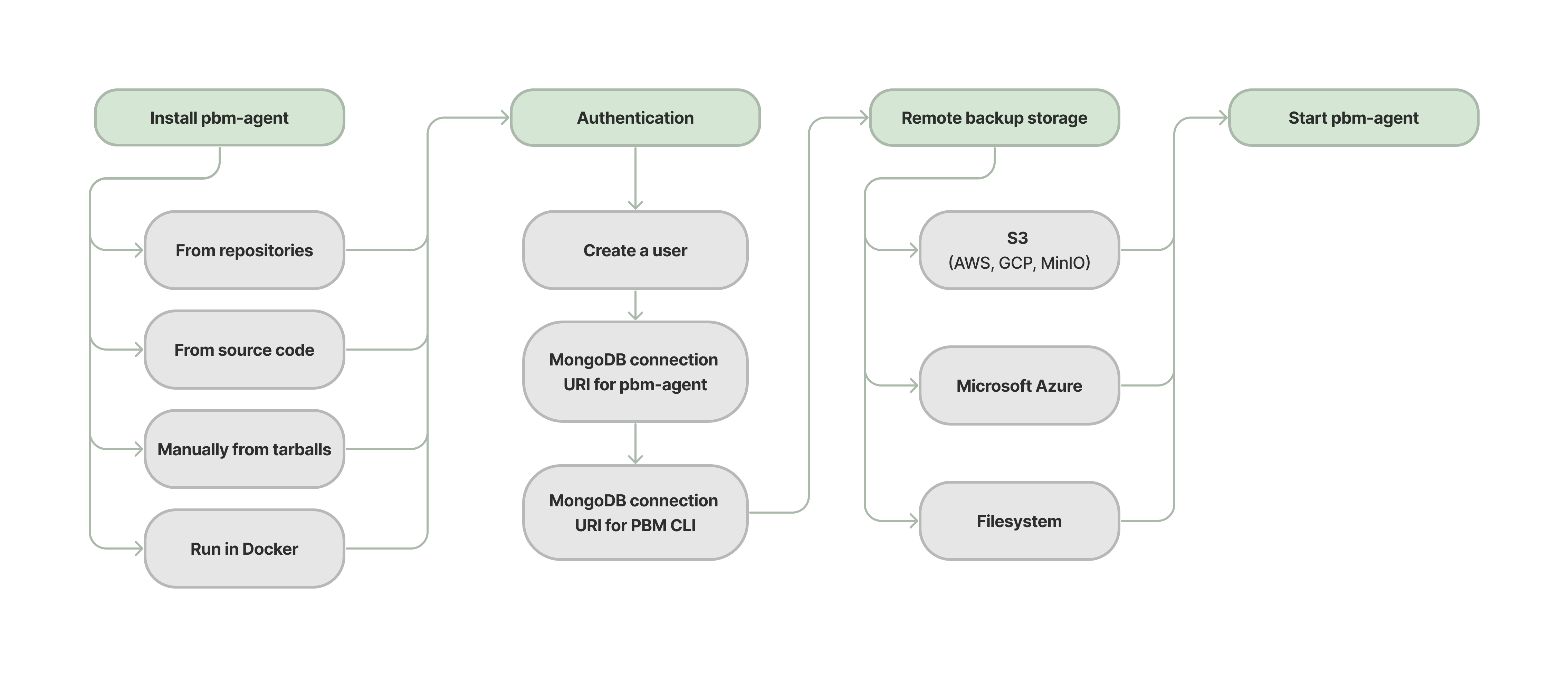 After you installed Percona Backup for MongoDB on every server with the mongod node that is not an arbiter node, complete the following setup steps: